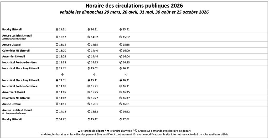 Vous pouvez rejoindre le tram historique aux arrêts suivants : Boudry Littorail, Areuse, Les Isles Littorail (en face du musée), Areuse Littorail, Colombier Littorail, Auvernier Littorail, Neuchâtel, Port-de-Serrières et Neuchâtel, Place Pury Littorail.