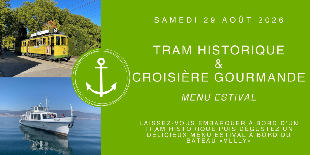 En fin de journée, vous embarquerez à bord d’un tram historique. Lors du voyage, un apéritif vous sera servi à bord. Nous terminerons ensuite notre route au Port de Serrières où le bateau « MS Vully » vous y attendra. Durant la croisière, nous vous servirons le menu servi en 4 plats. A l’issue de notre croisière, nous reviendrons au Port de Serrières et notre motrice historique vous ramènera jusqu’en ville de Neuchâtel puis jusqu’à votre destination le long de la ligne.
